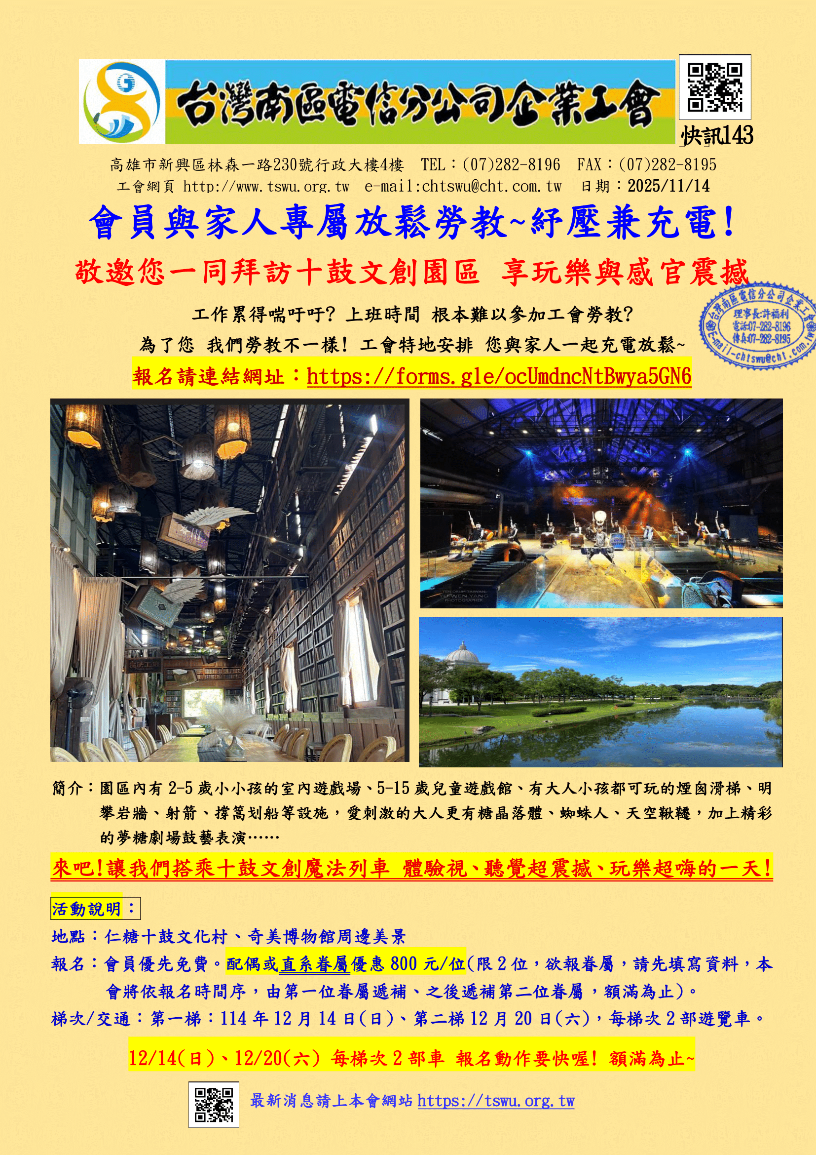 快訊143-工會放鬆勞教放~ 歡迎您與家人報名 分享 FacebookXRedditLinkedInTumblrPinterestVkEmail: 相關文章: 快訊141-敬祝中秋團圓 平安喜樂! 快訊140-經驗傳承補人力 延後退休才是王道!! 快訊139-工會招待蝶麵包下午茶會 歡迎訂購及8/29下午3點半蒞臨放鬆享用! 快訊138-本會聯手高雄市分會,股東會監督公司治理、為會員爭權益,進度報告 快訊137-【緊急通知】 蝶。麵包製作因豪大雨受挫 改8月1日(五)下午取貨 造成困擾 請見諒!!