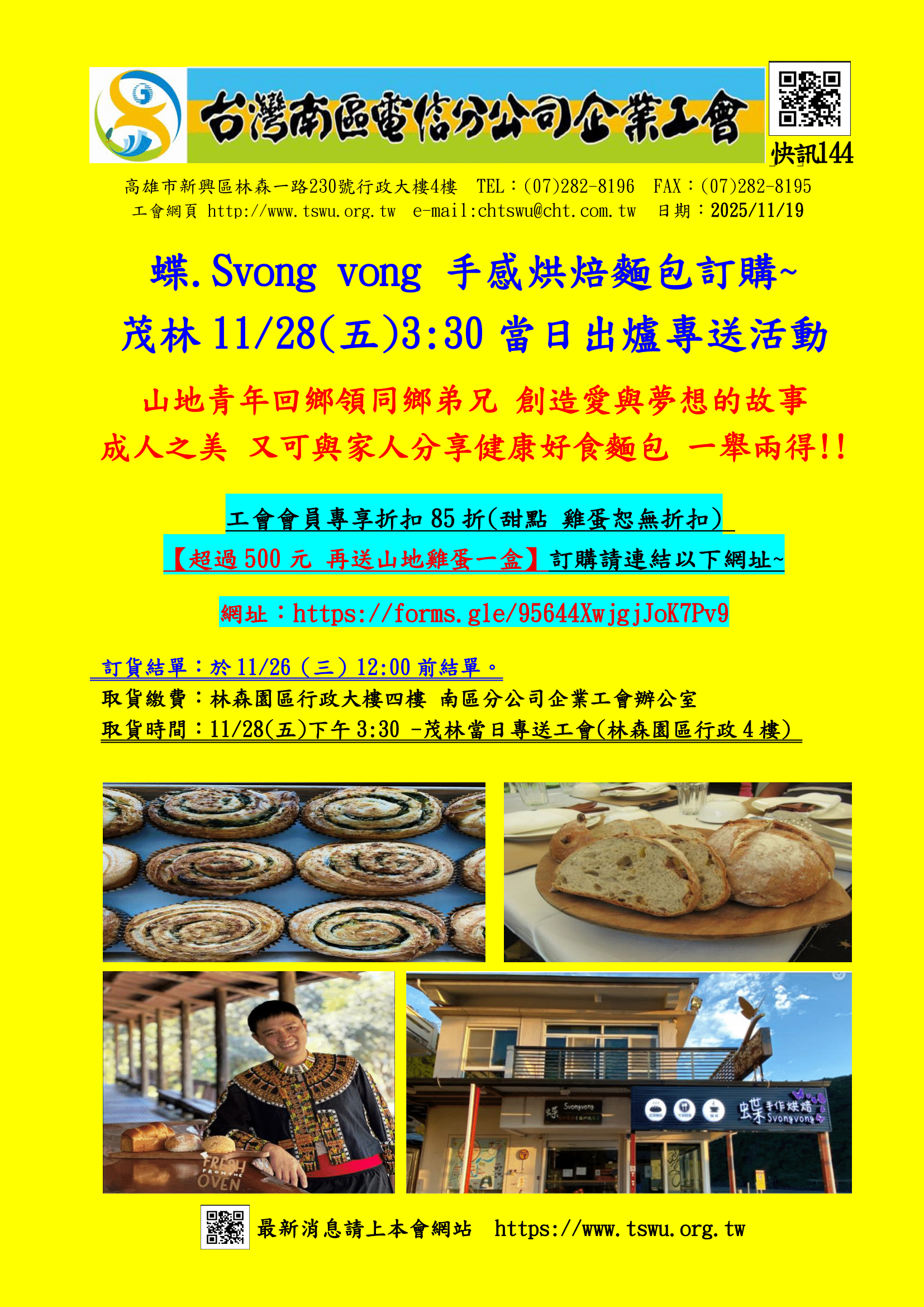 快訊144-茂林蝶麵訂購活動 分享 FacebookXRedditLinkedInTumblrPinterestVkEmail: 相關文章: 快訊143-工會放鬆勞教放~ 歡迎您與家人報名 快訊141-敬祝中秋團圓 平安喜樂! 快訊140-經驗傳承補人力 延後退休才是王道!! 快訊139-工會招待蝶麵包下午茶會 歡迎訂購及8/29下午3點半蒞臨放鬆享用! 快訊138-本會聯手高雄市分會,股東會監督公司治理、為會員爭權益,進度報告