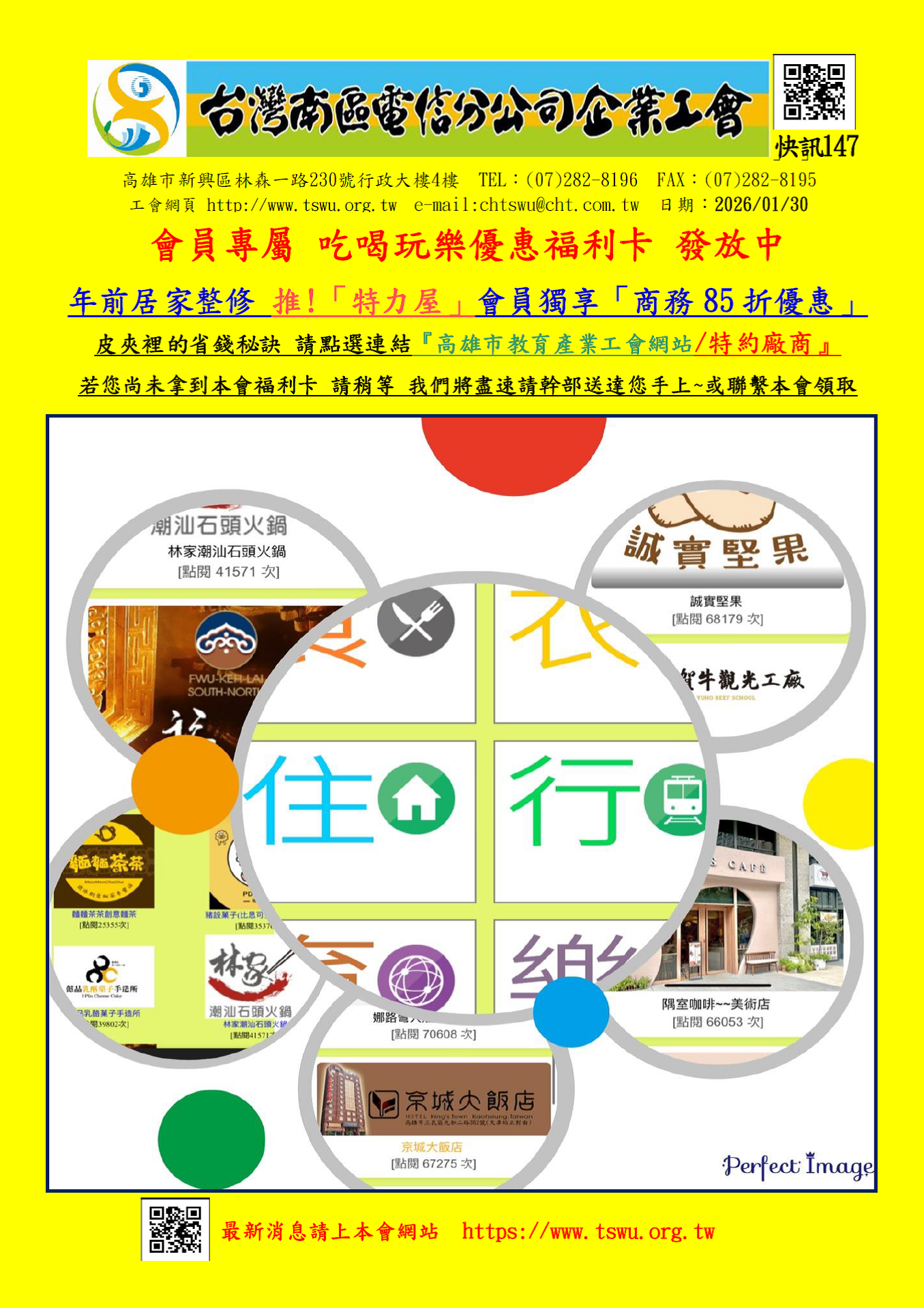 快訊147-福利卡發放 優惠好好用~祝大家 新年省錢快樂!! 分享 FacebookXRedditLinkedInTumblrPinterestVkEmail: 相關文章: 快訊146-1/22(四)3:30 工會招待下午茶會 快訊145-揮別2025年 迎接充滿希望的2026年!工會勞教精彩分享! 快訊144-茂林蝶麵訂購活動 快訊143-工會放鬆勞教放~ 歡迎您與家人報名 快訊141-敬祝中秋團圓 平安喜樂!