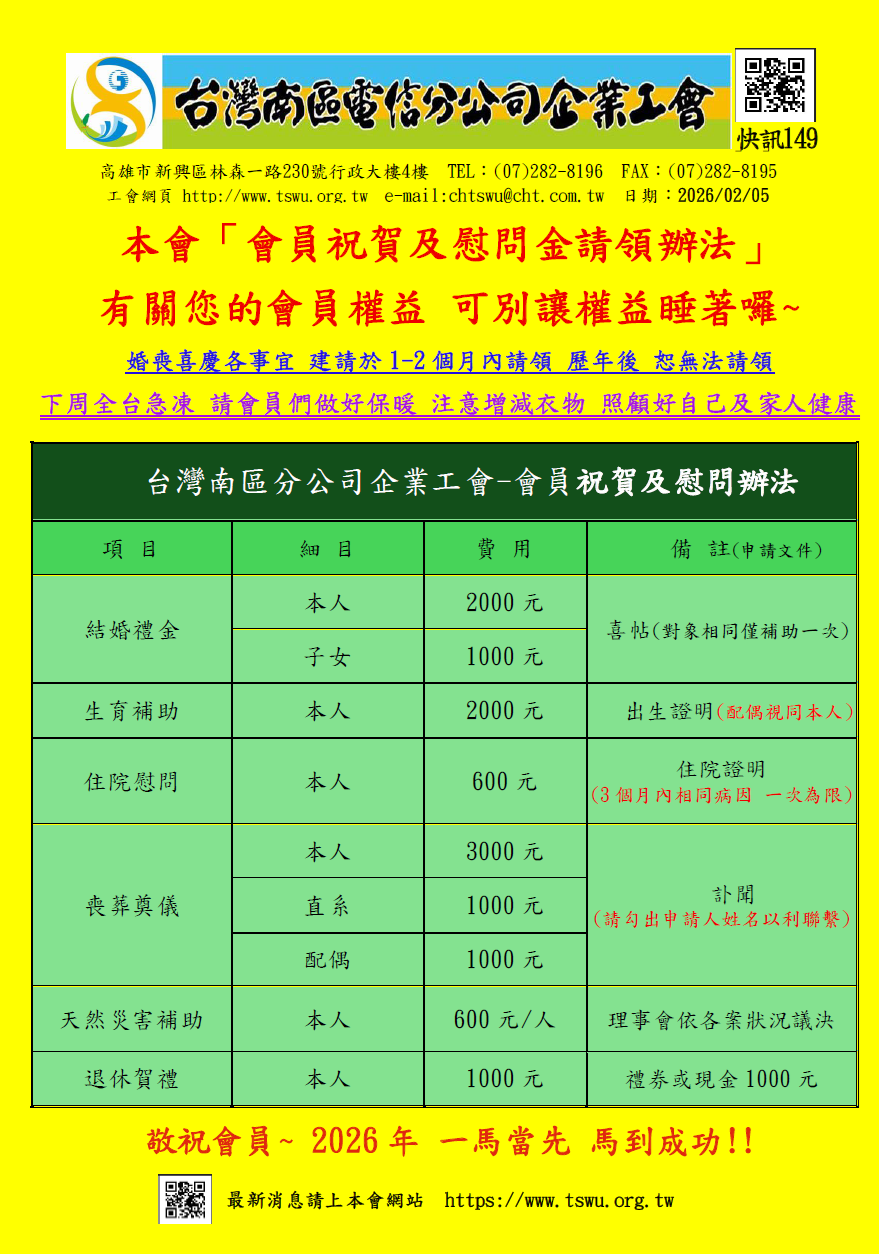 快訊149-會員權利提醒 敬祝會員 2026年 一馬當先 馬到成功! 分享 FacebookXRedditLinkedInTumblrPinterestVkEmail: 相關文章: 快訊148-2/3(二) 屏東會員日 工會關心您~ 邀請您報名 快訊147-福利卡發放 優惠好好用~祝大家 新年省錢快樂!! 快訊146-1/22(四)3:30 工會招待下午茶會 快訊145-揮別2025年 迎接充滿希望的2026年!工會勞教精彩分享! 快訊144-茂林蝶麵訂購活動