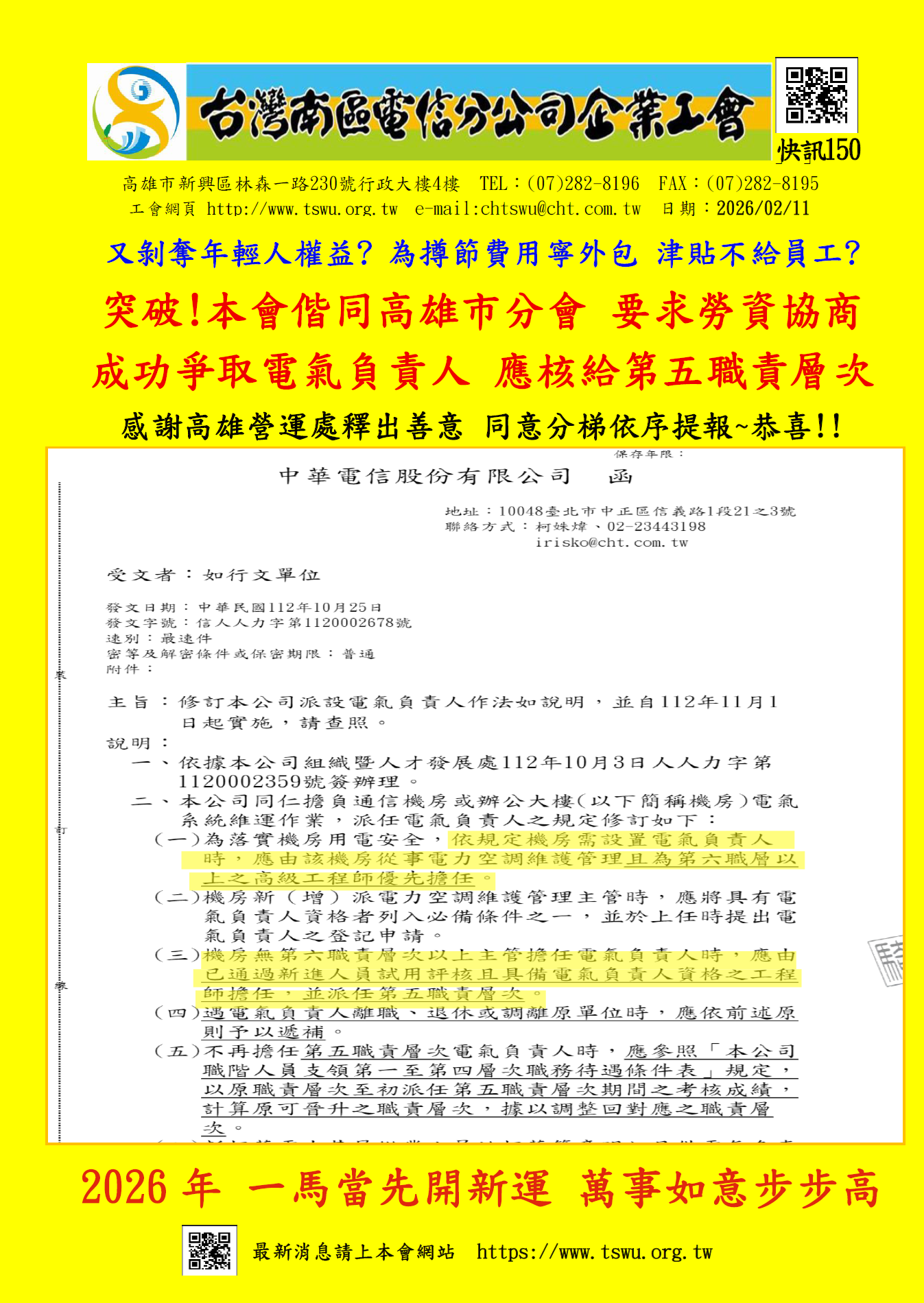 快訊150-爭取電氣負責人應核給第五職責層次~ 分享 FacebookXRedditLinkedInTumblrPinterestVkEmail: 相關文章: 快訊149-會員權利提醒 敬祝會員 2026年 一馬當先 馬到成功! 快訊148-2/3(二) 屏東會員日 工會關心您~ 邀請您報名 快訊147-福利卡發放 優惠好好用~祝大家 新年省錢快樂!! 快訊146-1/22(四)3:30 工會招待下午茶會 快訊145-揮別2025年 迎接充滿希望的2026年!工會勞教精彩分享!