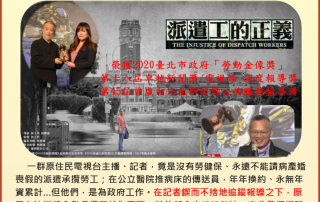 TVBS林上筠柯勝雄導演「派遣工的正義-我不是你的免洗筷」分享活動 時間:2020.11.17上午10:10,地點:中山大學國研大樓華立廳 第十八屆卓越新聞獎|電視類 深度報導獎 得獎作品 「派遣工的正義-- 我不是你的免洗筷」 得獎理由: TVBS團隊歷時三個月深入查訪、發文各部會、檢視官方外包員工特休年資合約,發現九成九皆採最低標,而非最有利標,當外包廠商削價搶標、砍到見骨,也砍掉了最弱勢的基本勞權。專題點出,公部門違反自訂《勞務承攬行政指導》,遊走灰色地帶,當囿於編制的官方都鑽法規漏洞,私人企業豈不跟進?。/記者以強烈反差,訴說著同業原住民族電視台的主播和記者,竟是沒有年資累計、沒有勞健保、也沒有婚喪產假的承攬工,踢爆政府外包員工的醜陋真相,讓觀眾一路看下去有強烈的不捨與敵愾。但在記者鍥而不捨的追蹤報導之下,原民台決議將全數承攬工納為正職,其他部會也紛紛效法,充分發揮媒體第四權的功能,表現令人讚賞。
