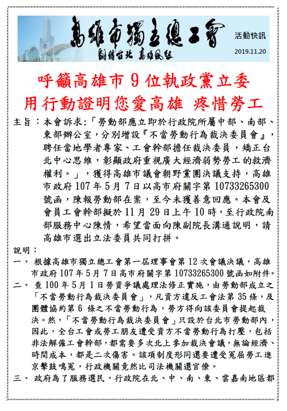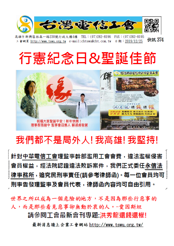 台灣電信工會 新聞稿 2019.12.25 張緒中遭中華電信工會兩度違法除名,均經法院判決張緒中勝訴定讞,張緒中及工會會員委任律師,依法追訴理監事民刑事責任。 台灣電信工會特別在108年12月25日行憲紀念日發佈新聞稿,凸顯過去六年,中華電信工會既得利益集團,因未經法定程序修改章程,剝奪會員直選理事長、自肥延長任期、片面提高會費等濫權行徑,經高雄勞方工會幹部向主管機關陳情檢舉,揭露中華電信工會集團自肥反民主行徑,遭法院認證濫權除名 違法延任 反普選。針對中華電信工會幹部違法侵權行為,及主管機關勞動部、勞工局相關瀆職圖利官員,已先行委任永信法律事務所108年12月19日發出律師函詳如附件。未來工會將延聘律師提起民、刑事及國賠,俾利建立依法行政,保障勞工憲法言論自由、集會結社及訴訟權利,防止人民團體幹部濫權自肥反民主。 壹、法院認證濫權除名 違法延任 反普選。 2009年3月張緒中兩屆理事長屆滿裸退,2010年9月在張緒中取得博士學位申請復職後,中華電信工會既得利益集團,擔心由會員直接選舉理事長(兼任勞工董事)制度不利連任,未經法定程序修改章程,一、取消理事長(兼勞工董事)由會員直接選舉。二、延長任期從三年改為四年。三、片面提高會費。原高雄市分會自主勞方代表行使公民行動權,向行政主管機關及監察、立法、司法機構陳情檢舉,噵致中華電信工會當權派濫用權力,一、高雄市分會被拆解裁撤,全台唯獨原高雄市分會劃分5個選區(所有分會只有一個選區,應選兩名以上採連記法)。二、許福利遭停權2次,張緒中除名2次,停權1次,台北孫虔修、王佩君停權,並藉由超過20起刑事告訴,企圖嚇阻高雄會員繼續陳情行動。三、原高雄市分會遭裁撤,剝奪會員章程明定選舉權與被選舉權,第七屆任期已過半,至今未改選。 貳 中華電信工會公然偽造全額表決通過公文,閹掉會員普選理事長權利。 張緒中理事長指出: 依據工會法第26、27條明文規定,工會章程修正程序與法定議決人數;且 工會法第32條明定:工會章程之修改或理 事、監事、常務理事、常務監事、副理事長、理事長、監事會召集人 之變更,應報請主管機關備查。中華電信工會理事長直接選舉改間接選舉,延長任期一年、調高會費,均涉及工會章程修改。中華電信工會第五屆任期內,均超過三分之一會員代表,反對取消理事長直接選舉制度,根本沒有進行修正章程第11條任何議事程序。前理事長朱傳炳竟然於100年2月15日,竟以電工五(100)組字第078號函,偽造文書函復勞委會稱:「工會章程第11條係經大會出席全體代表全額表決通過。」,2012年4月12日,由趙天麟立委邀請勞委會勞資關係處處長劉傳名、江衍平科長,中華電信工會理事長朱傳炳、高雄市分會理事長柯震榮暨理監事、台灣通信網路產業工會張緒中理事長等協調,經勞委會、中華電信工會、高雄市分會等代表同意簽認協調會結論:『勞委會原則上一週內邀集總會、高雄市分會及陳情代表就章程第 十一條爭議部分,調出當次會議全程錄影進行事實認定,地點於 中華電信工會總會辦公室進行。