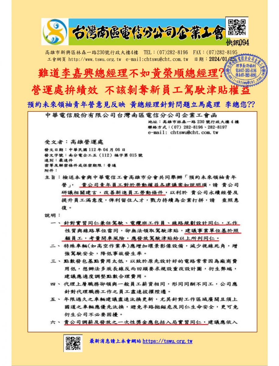 快訊095-請落實公司承諾之員工考核面談 並請重視組改後南區員工考核 應公平對待!