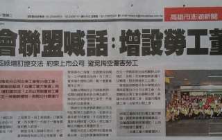 定稿台灣工會大聯盟說帖1040309 大聯盟新聞稿1040309 台灣工會大聯盟(Monitor CSR)採訪通知暨新聞稿 高雄市新興區林森一路230號行政大樓4樓 TEL:(07)282-8196 FAX:(07)282-8195 大聯盟fb: https://www.facebook.com/?ref=tn_tnmn#!/groups/1567136610195920/ e-mail:[email protected] 日期:2015/03/08 台灣工會大聯盟呼籲:國、民兩大黨能夠立即推動「增訂證券交易法第14條之7,上市公司應置勞工董事制度,將「勞工是寶貝、員工是資產」口號,落實成為今年五一勞動節,執政黨為台灣下一代留下一個有價值動人故事。 台灣工會大聯盟(Monitor CSR)成立大會 時間:2015年3月9日上午10時 地點:高雄捷運美麗站會廊二聖廳